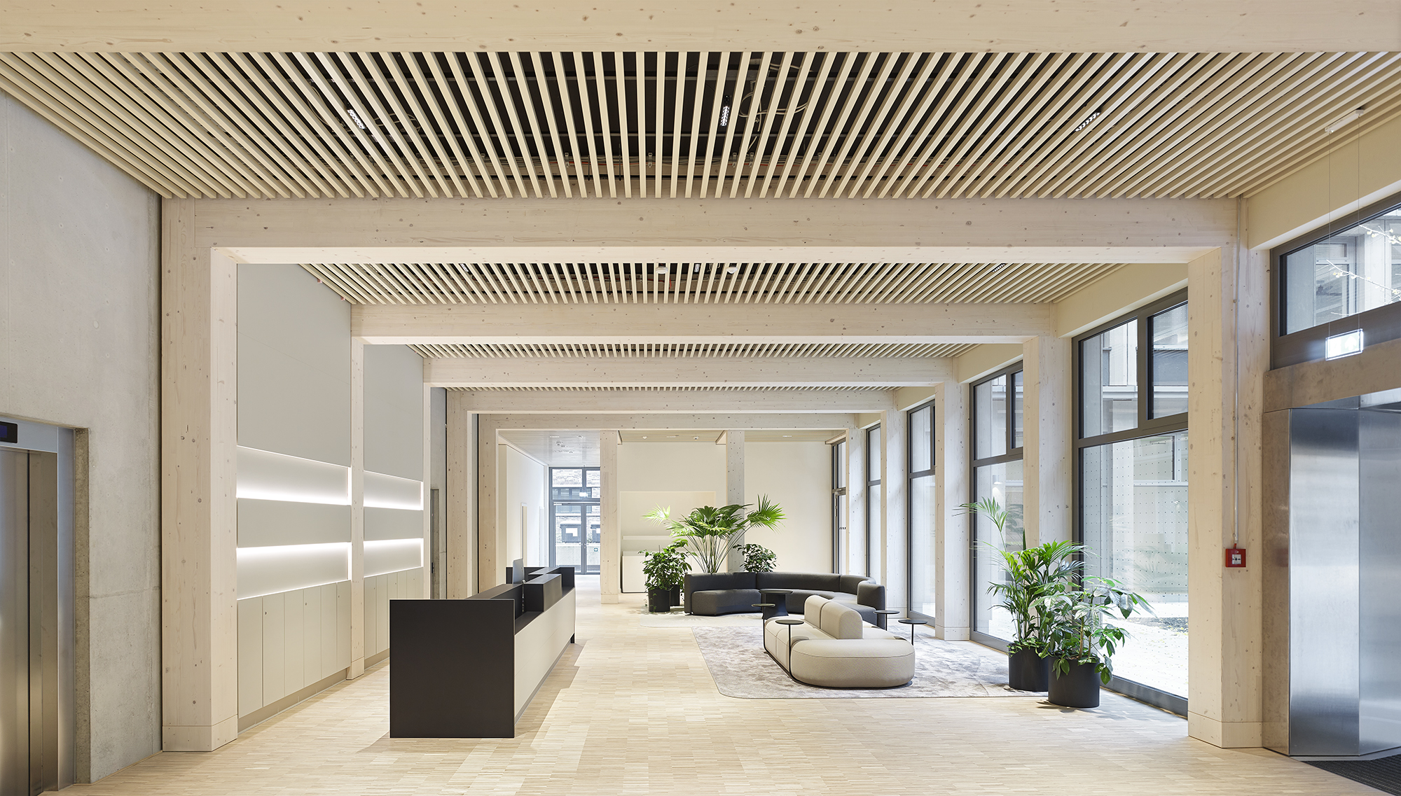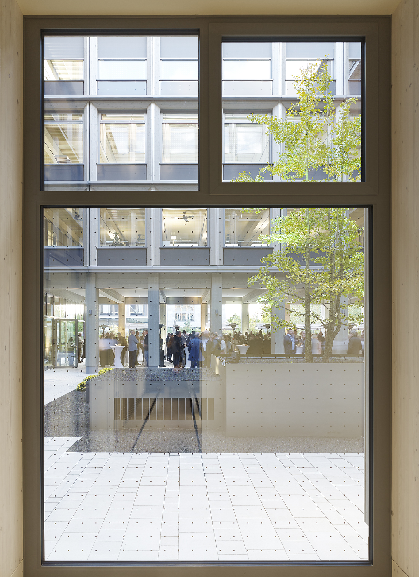 Die Grundkonstruktion ist mit Stützen und Trägern aus Brettschichtholz und aufliegenden 12cm starken Decken aus Brettsperrholz ausgeführt.Die lichten Geschosshöhen und die Stützenfreiheit ermöglichen einen zukünftigen Umbau des Parkhauses in eine Wohn- oder Arbeitswelt mit schönem, natürlich belichtetem Innenhof anstelle der mittig angesiedelten Fahrrampe.
